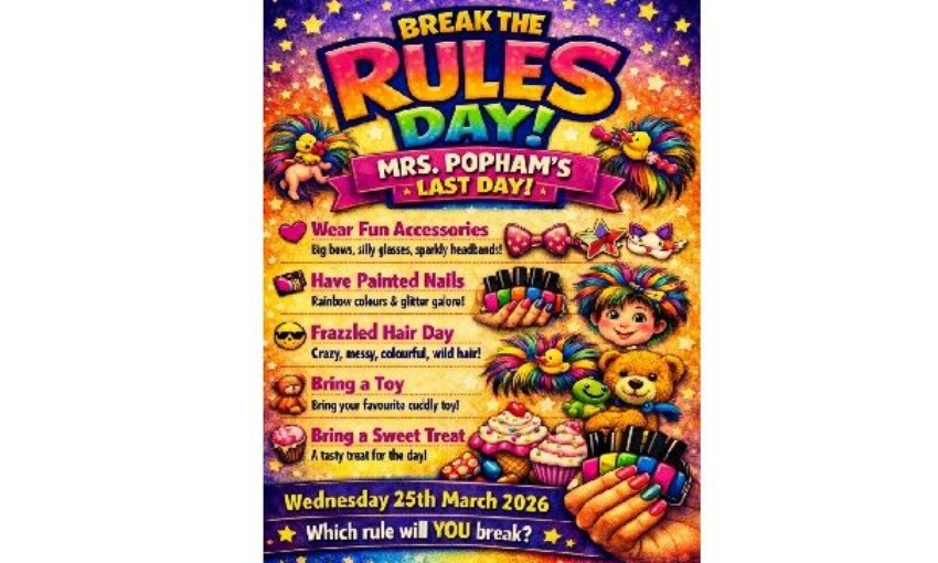Mrs Popham has always said we need a “Break the Rules Day”… and now, for her last day on Wednesday 25th March, Mrs Beetlestone has (bravely!) agreed to make it happen!